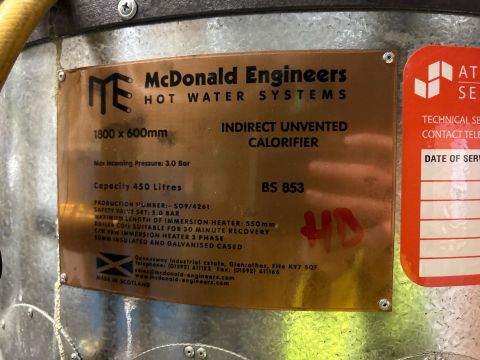 McDonald Engineers Indirect Unvented Calorifier 450L, 3 Phase, 1800x600mm, S09/4261