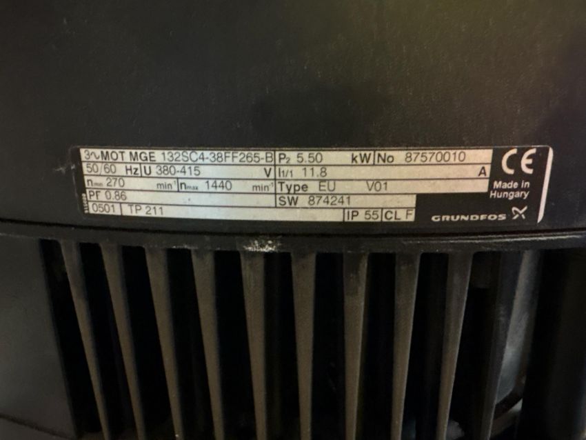 Grundfos TPE 100-170/4 AFA-BAQE inline centrifugal pump, 5.5 kW (7.38 HP) MGE 132SC4-38FF265-B motor, DN100 (4 in.) flange, 82.8 m³/h (364.3 GPM) max flow, 15 m head, 16 bar rated pressure, 3-phase 380-415V, 50/60 Hz, IP55, insulation class F, includes flanges, electrical connection, made in Hungary, weight approx. 170 lbs (77 kg), asset label: 96110451P2050002-2.