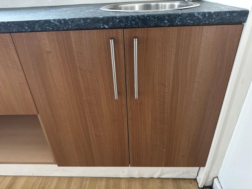 1 x Wooden Unit comprising of double door cabinet, Deep drawer, Sink, Black Patterned Worktop, Kimberley Clark towel & soap dispense and light