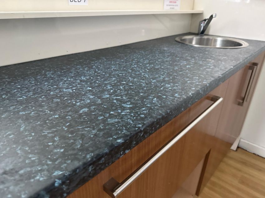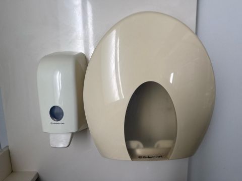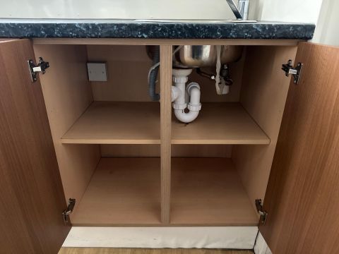 1 x Wooden Unit comprising of double door cabinet, Deep drawer, Sink, Black Patterned Worktop, Kimberley Clark towel & soap dispense and light
