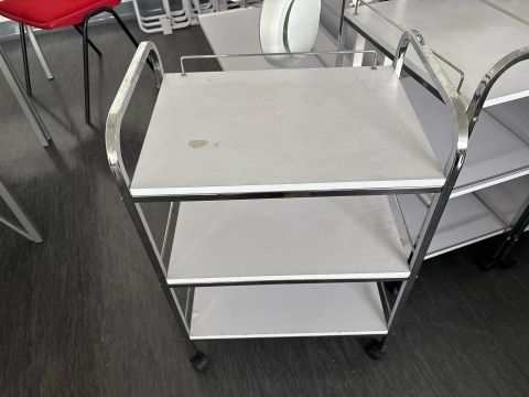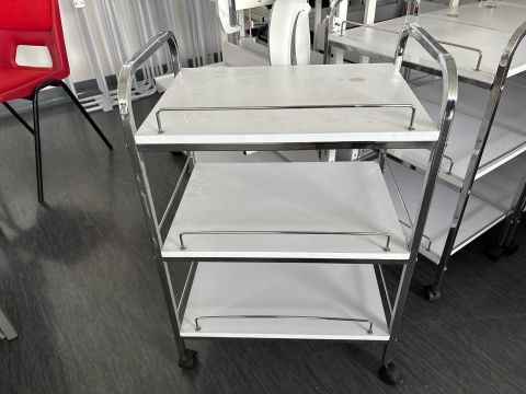 Three Tier Metal Wheeled Trolley With White Wooden Shelves