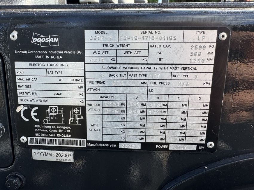 2020 Doosan 2.5 Tonne Gas forklift truck Container Spec , 6833 Hours