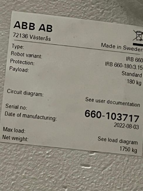 ABB IRB 660-180/3.15 industrial robot system, manufactured September 2022, complete with IRC5 controller. Designed for high-speed palletising and material handling applications, this model offers a 180kg payload and 3.15m reach.