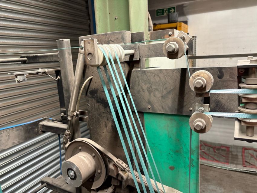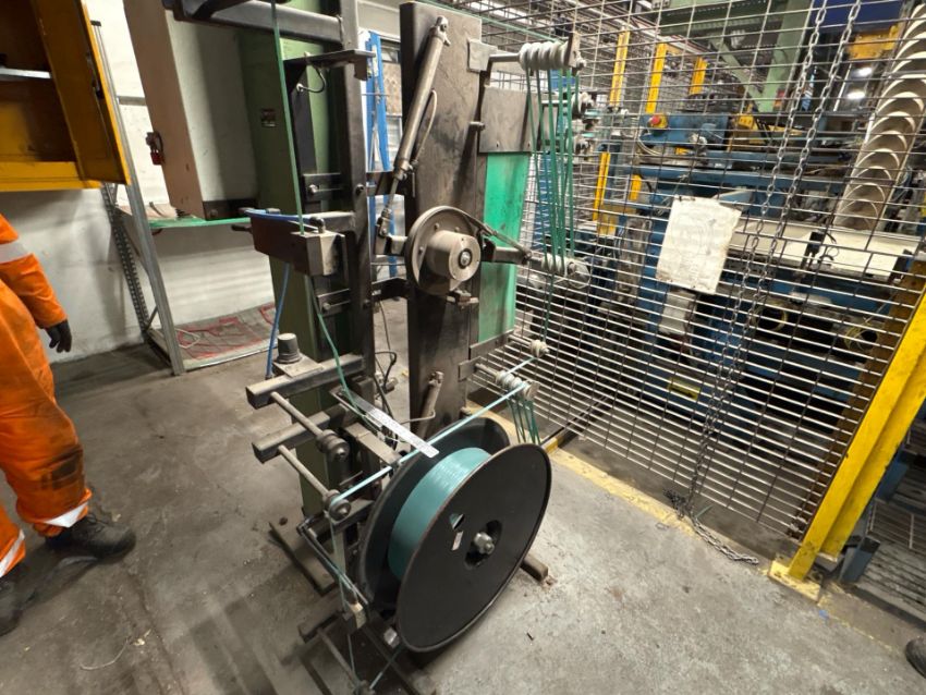 Includes floor mounted banding trolley, metal gantry with bander on top and control panel with reel stat