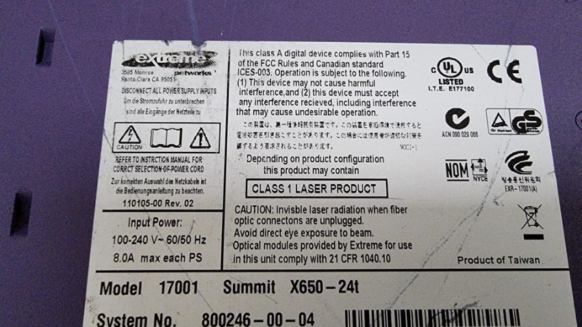 - 1x Extreme Networks X650 850W Power Supplies (10914)