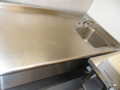 Catering table with integrated sink system. 191cm w 80cm d 93cm h. Stainless steel with shelf.