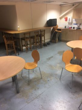 24 x cafe chairs, 5 x large circular tables, 7 x bar stools, 1 x large noticeboard. Everything to fill your factory cafeteria needs!