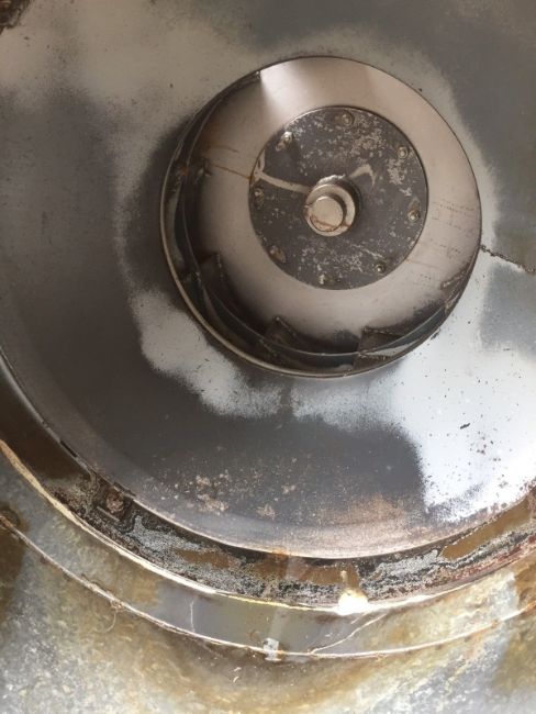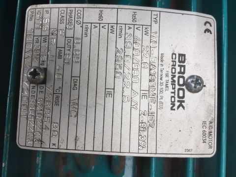 Industrial 22kW Extractor Fan, Wood Chip Grian Drier. Dimensions - l 170cm, w 155cm, h 140cm, fan diameter approx 55cm x 23cm wide. 22kW, 50Hz, 2950 rpm, 400v 39A/22.5A. Manufactured 2012