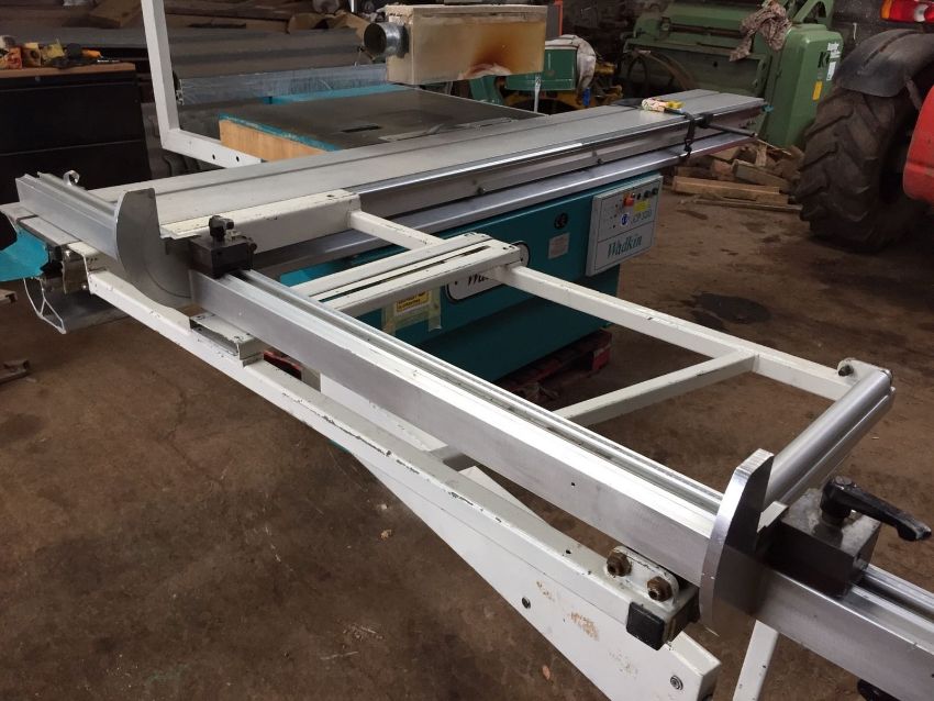 Wadkin CP320 Panel Saw. Main blade diameter 400mm giving a depth of cut of 135mm. 5.5kW/ 7.5hp main motor. Scoring/ scribe unit fitted. 3200mm Sliding Table.