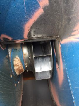 Industrial 18kW Extractor Fan Wood Chip Grain Drier Manufactured by JHM. Dimensions - l 150cm, w 100cm, h 134cm, fan diametr approx 45 x 13.5 cm wide. 50 Hz, 2625/3300 rpm, total pressure 3737Pa, 10200 m3/h, 380-420v, 32.5A, motor 2940rpm. Manufactured 2007.