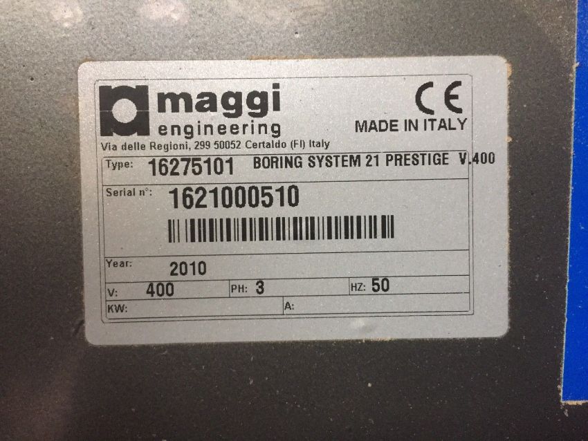 Maggie 21 Prestige Multi Drill Multiborer, 21 drill capacity, 1 x 21 vertical spindles which pneumatically tilt for 1 x 21 horizontal spindles for end boring and pneumatic clamping, comes with two fences. Manufctured 2010.