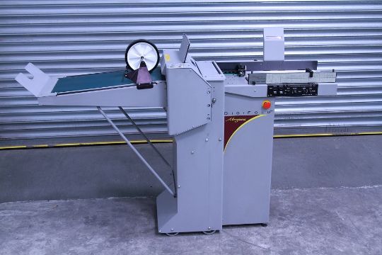 The Morgana Digifold - Creaser and Folder is one of our best selling folders. The Digifold has it all, accuracy, reliability and it is easy to use. By having both a creaser and folder in one, this machine would be an asset to any company. Contact us today to discuss this Morgana Digifold. After the success of the AutoCreaser and the best-seller UFO Folder, Morgana came up with something entirely new. Thus presenting the DigiFold. Combining the traits of a creaser and folder into one, with added prestige and quality. Using a creasing automated creasing technology along with an electronically controlled flying knife contoured around extra large diameter rollers moving at the same peed as the material passing through the machine. The DigiFold boasts a dynamic sheet deflector that only comes in contact with the leading edge of the sheet. This allows multiple folds to be done without the risk of scratching or marking OVERALL DIMENSIONS POWER REQUIREMENT - 1ph 220/240v MAXIMUM SPEED A4 S.P.H. - 1800 MAXIMUM SHEET SIZE - Length 630mm - Width 330mm MINIMUM SHEET SIZE - Length 160mm Width 140mm MAXIMUM PAPER WEIGHT - 350gsm+ MINIMUM PAPER WEIGHT - 90gsm MAXIMUM NUMBER OF CREASES PER SHEET - 9 MAXIMUM NUMBER OF FOLDS PER SHEET - 2 MAXIMUM NUMBER OF STORED PROGRAMMES - 6 MINIMUM REPEAT CREASE DISTANCE - 4mm (depending on paper weight) MINIMUM CREASE DISTANCE FROM LEADING EDGE - 25mm MINIMUM FOLD DISTANCE FROM LEADING EDGE - 25mm (depending on paper weight) |