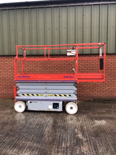 Skyjack SJ3226 scissor lift cherry Picker, 523 hours. Comes with non marking tyres, built in 110/240v charger. Extendable sliding deck, fold down rails.Working height - 9.9m Max platform height - 7.9m Height (stowed) - 2150mm Length (stowed) - 2320mm Width (stowed) - 810mm Weight - 1877kg