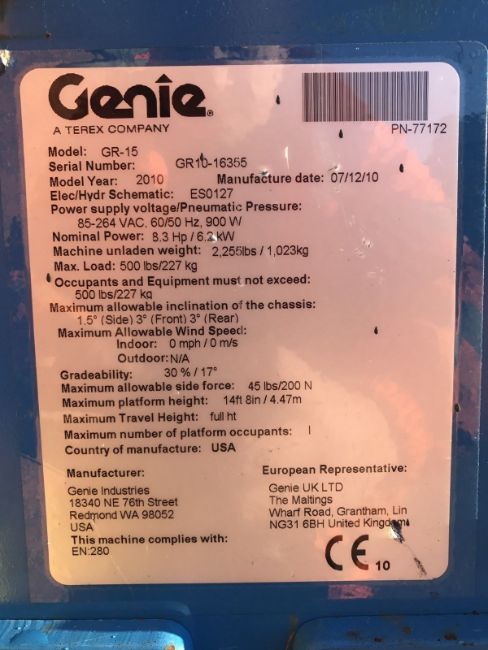 2010 Genie GR15 scissor lift cherry Picker, 353 hours and is in very good condition as you can see in the pictures. It has a good set of deep cycle batteries. Comes with non marking tyres, built in 110/240v charger. Extendable sliding deck, gen 5 controller.Working height - 6.52m Max platform height - 4.52m Height (stowed) - 1570mm Length (stowed) - 1350mm Width (stowed) - 750mm Weight - 994kg