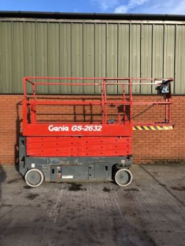 Genie GS2632 scissor lift cherry Picker, 461 hours Comes with non marking tyres, built in 110/240v charger. Extendable sliding deck, fold down rails. Working height - 9.92m Max platform height - 7.92m Height (stowed) - 2260mm Length (stowed) - 2440mm Width (stowed) - 810mm Weight - 2002kg
