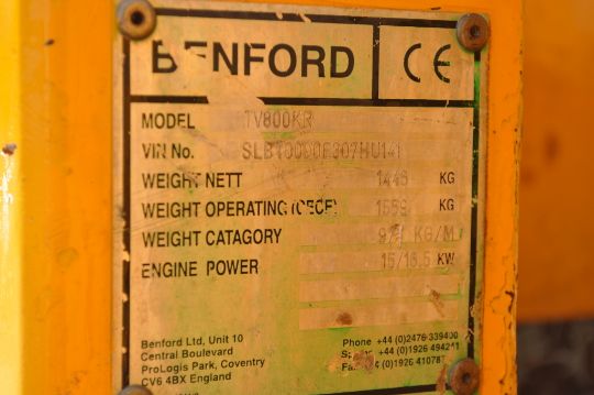 TEREX BENFORD TV800YEAR: 20031338 HOURSDOUBLE DRUM VIBRATING3 cyl KUBOTA DIESEL ENGINE 15 kW DRUM WIDTH: 800 mmDIMENSIONS (LxHxW) mm: 1860 x 1530 x 870OPERATING WEIGHT: 1559 kg