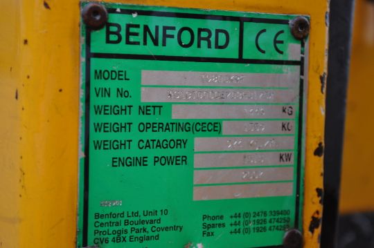 TEREX BENFORD TV800 YEAR: 2007 1363 HOURS DOUBLE DRUM VIBRATING 3 cyl KUBOTA DIESEL ENGINE 15.5 kW DRUM WIDTH: 800 mm DIMENSIONS (LxHxW) mm: 1860 x 1530 x 870 FOLDING ROPS OPERATING WEIGHT: 1559 kg
