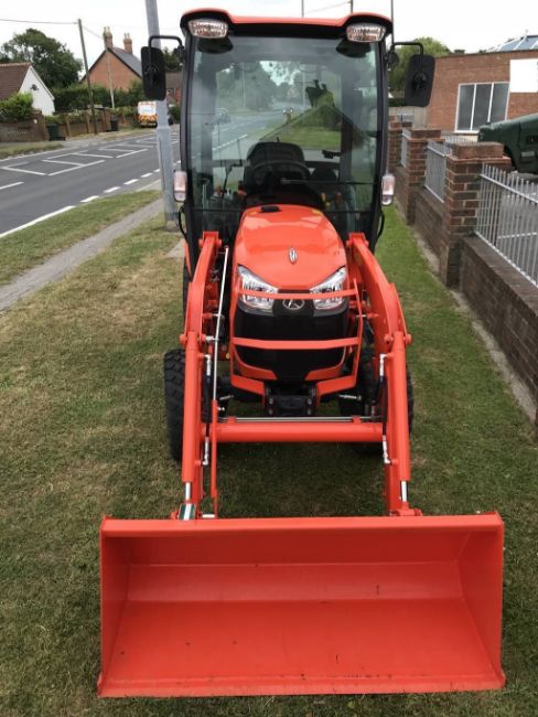 Kubota B2350HDB Compact Tractor Fitted with the Following: 20.7hp 3-Cylinder Water Cooled E-TVCS Diesel Engine, Hydrostatic Transmission, Infinite 3 Range Speeds, Independent PTO, Bi-Speed Turn Steering, 2 Rear Hydraulic Valves (Dual Action), Super B Cab, Front Loader and Bucket, Industrial Tyres.