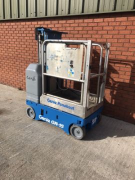 Genie GR15 for sale. Only done 470, very good condition. Good set of deep cycle batteries. Non marking tyres, built in 110/240v charger. Extendable sliding deck.SpecificationWorking height - 6.52mMax platform height - 4.52mHeight (stowed) - 1570mm Length (stowed) - 1350mmWidth (stowed) - 750mmWeight - 994kg