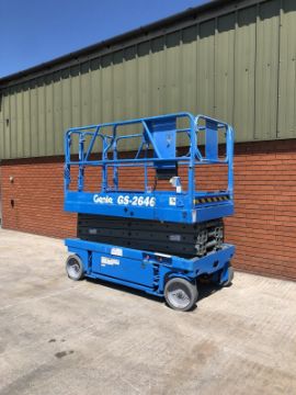 2000 Genie GS2646, 607 hours, very good condition, has a good set of deep cycle batteries. Comes with non marking tyres, built in 110/240v charger. Extendable sliding deck. This lift has been fully refurbished around 2/3 years ago so is in very good condition for age! Specification Working height - 9.92m Max platform height - 7.92m Height (stowed) - 2260mm Length (stowed) - 2410mm Width (stowed) - 1170mm Weight - 1956kg