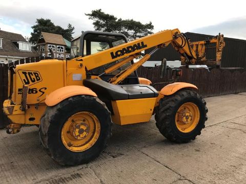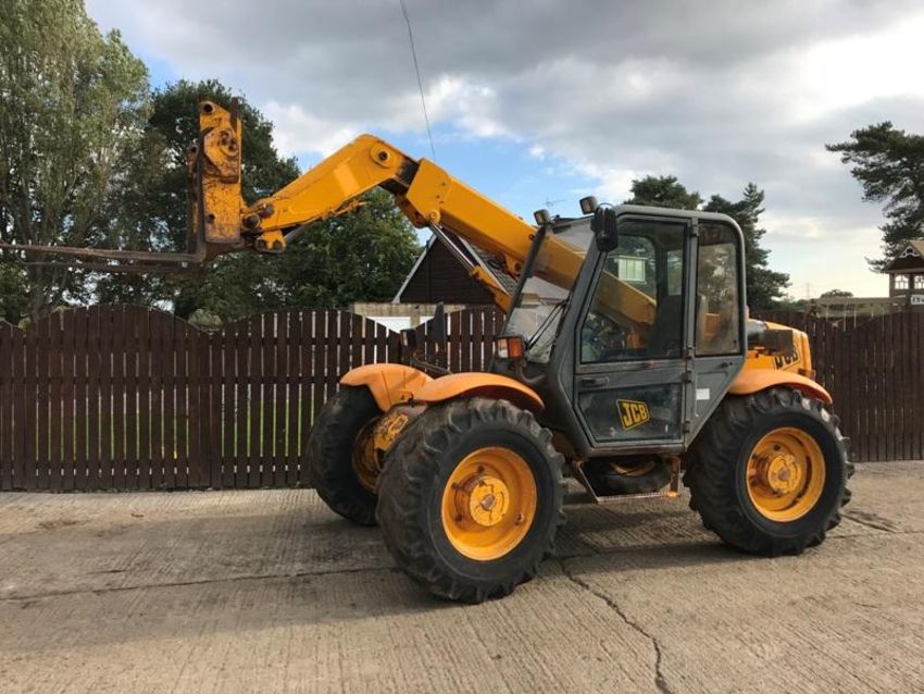 JCB 526 TELE HANDLER WITH PALLET TINES, CLUTCHLESS FORWARD AND REVERSE SHUTTLE DRIVE, 4 WHEEL STEERING / 2 WHEEL STEERING / CRAB STEER, MANUAL GEARBOX, 4WD, PIPED FOR THIRD SERVICE, PICK UP HITCH, JOYSTICK CONTROLS, GOOD HYDROLIC PUMP, NEW RADIATOR AND FAN RECENTLY FITTED, CAME OFF ARABLE FARM, PERKINS FAZER ENGINE