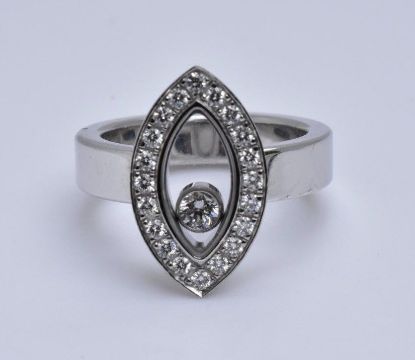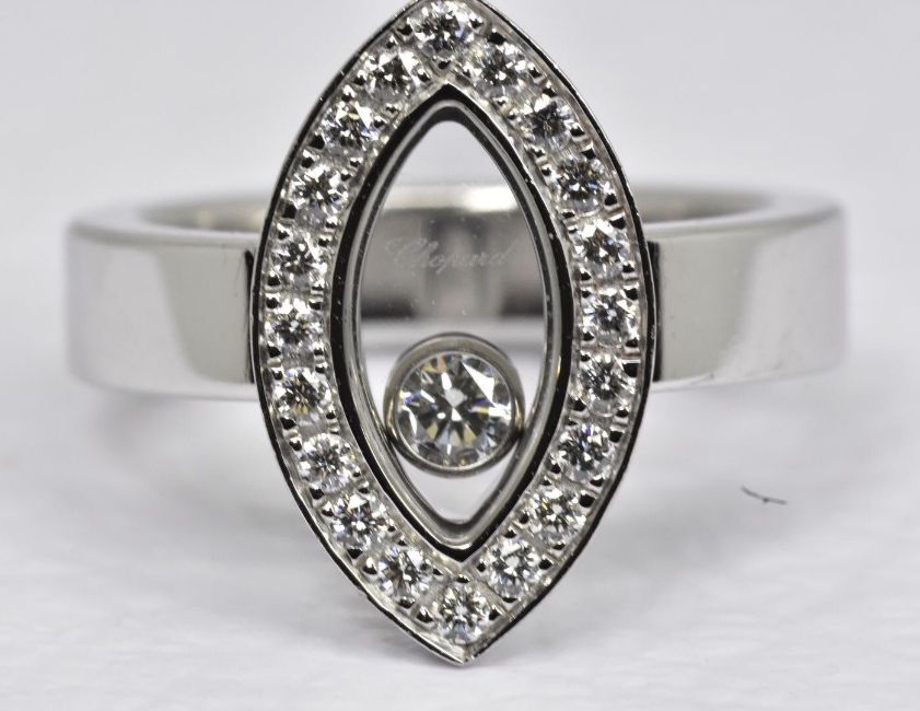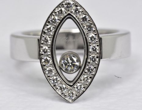 The ring featurins a floating round-cut diamond, weighing approximately 0.05 carats, in a marquise-shaped frame, set with 20 round brilliant-cut diamonds, weighing a total of approximately 0.30 carats, with G-H color and VS clarity, Size: UK H US 4-1/2 EU 46 1/2 Weight: 9.5 grams Signed Chopard; Stamped 750; Numbered 6038664 82/5716/0