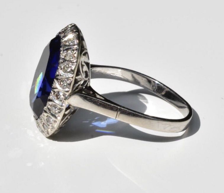 Transparent blue stone, mounted with 20 round single cut diamonds on a border cluster ring. Weight: 5.44 grams Dimensions of the stone: 14x10 mm Depth - 5.1 mm Synthetic Sapphire weight: approx 5.25 carat Size: UK P, US 7 1/2 EU 56 1/2