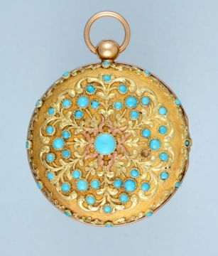 Turquoise Set Gold Verge Hunter Pocket Watch. An early 19th Century French verge in a turquoise set three colour gold full hunter case. Circa 1820 Diameter 38 mm Anonymous French
