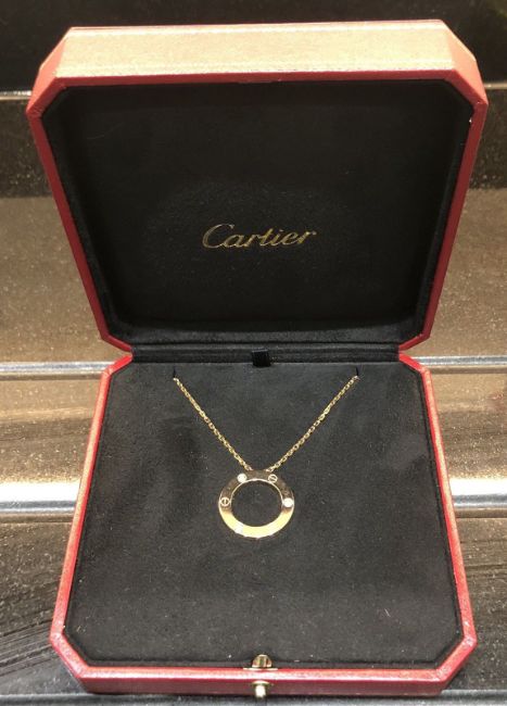 The necklace features a circular pendant with 3 diamonds and 3 screws set to a 17 inch chain. Measurements: 17 inches long Pendant: 23mm in diameter Diamonds: approx. 0.09 carat Hallmarked: Love, Cartier, 750, AOA762 Weight: 14.1 grams