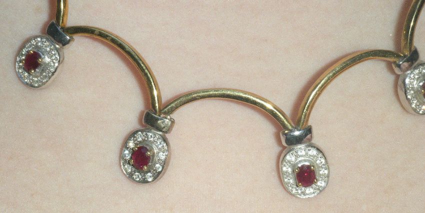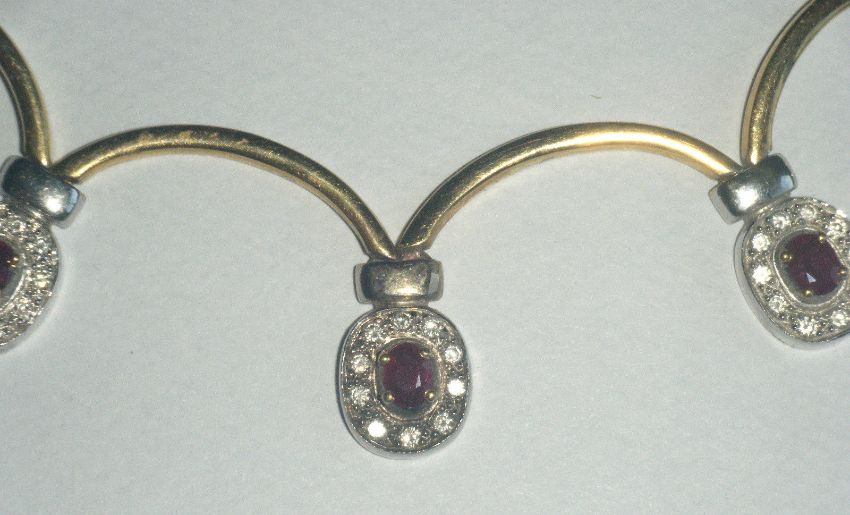 Vintage 18ct Gold Ruby and Diamond Necklace. it is hallmarked with the 750 stamp for 18ct gold , marked on the chain. SIZE 18 inch long. The diamonds are of the highest quality grading, we are looking at Si1 - H Colour, approximately 1.60 carat of diamonds in all. Collection Only