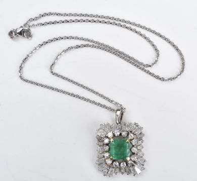 Weight: 9.8 grams Measurements: Pendant 2x2 cm approx Necklace: 16 inches Emerald weight: 1.5 carats approx Diamond weight: 2.5 carats approx