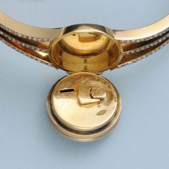 Very Early Diamond Set Gold Bracelet Watch. A late 19th Century Swiss cylinder in an unusual diamond set gold bracelet. Circa 1880 Diameter 19 mm Anonymous Swiss