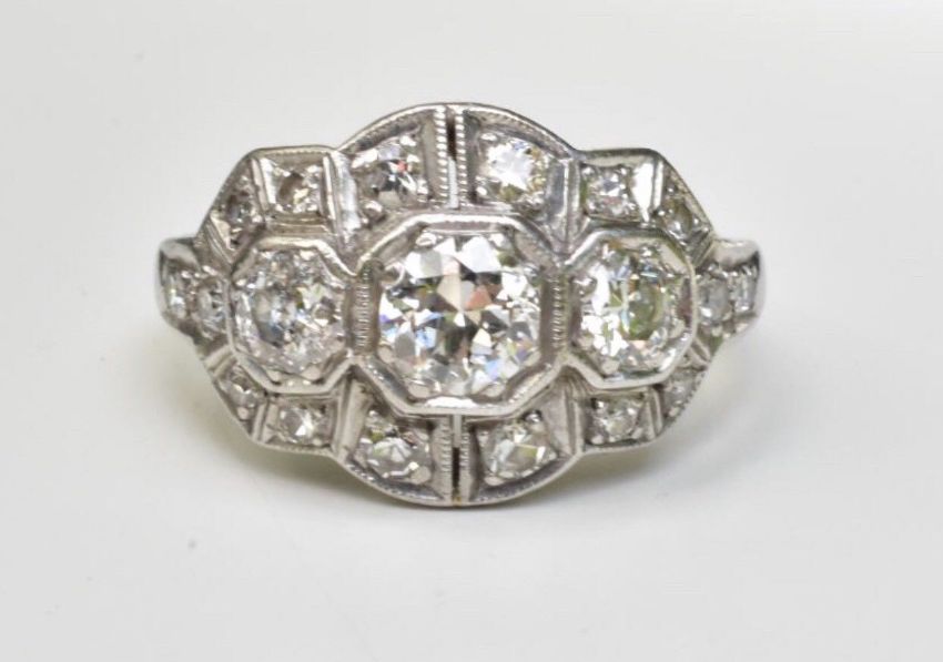 4.8 mm x2.8 mm .39 carat 3.7 mm x 3.7 mm x 2.05 .17 carat 3.6 mm x 3.6 mm 1.9 mm .15 carat Clarity: SI -1 Color: G-H Cut: European Additional Diamonds -16 -single cuts 1.5 mm - 2.0 mm - .32 carat Hallmarks: D Mr D engraved on the inside of the band Total weight: 3.7 grams Measurements: height 11mm Width 18mm Ring Size : UK L , US 6, EU 51 1/2 Diamond weight: 1.10 ctw