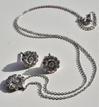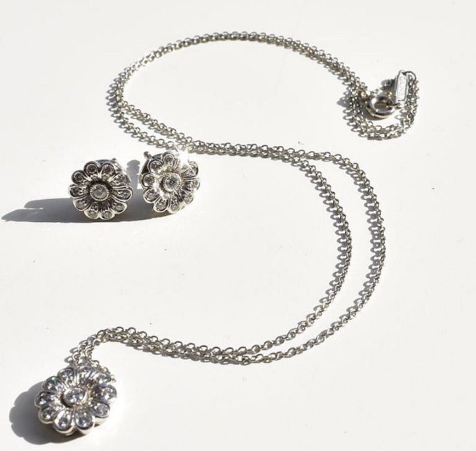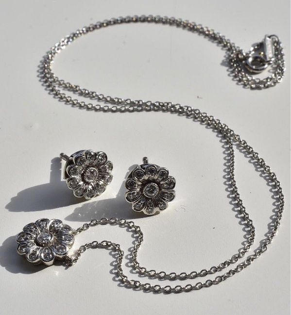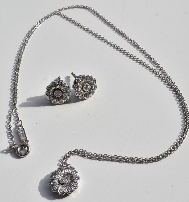 The earrings set with round brilliant- cut diamonds in a daisy flower with approximately 0.46 carats total. The matching necklace features a flower head daisy pendant set with round brilliant-cut diamonds of approximately 0.29 carats total suspended from a belcher platinum link chain, 17.5 inches long The items are sold with the original Tiffany & Co earrings box and necklace pouch Hallmarked: T & Co. P950, with full 2007 platinum hallmark Earrings Measurements: 9mm diameter Necklace Measurements: 10mm diameter Necklace Length: 17.5 inches