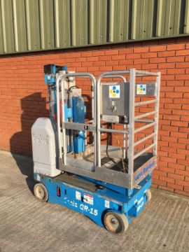 2005 Genie GR15 Scissor Lift Here we have 2005 Genie GR15 for sale. It is only showing 383 hours and is in very good condition as you can see in the pictures. It has a good set of deep cycle batteries. Comes with non marking tyres, built in 110/240v charger. Extendable sliding deck.SpecificationWorking height - 6.52mMax platform height - 4.52mHeight (stowed) - 1570mmLength (stowed) - 1350mmWidth (stowed) - 750mmWeight - 994kg