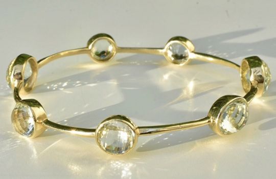 Green Amethyst Bangle Bracelet 18k. A green amethyst gem bracelet let in 18k yellow gold. The bracelet features seven fancy-cut green amethyst set to a plain gold band. Gemstones: Green amethyst Measurements: bangle is 61mm in diameter. Bracelet top is 10.5mm at widest point. Gold: 18K. Weight: 15.3 grams. Condition: Good condition with onlt very light signs of use, the gem stones are in good condition with no damage to the stones or settings