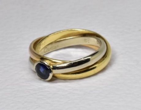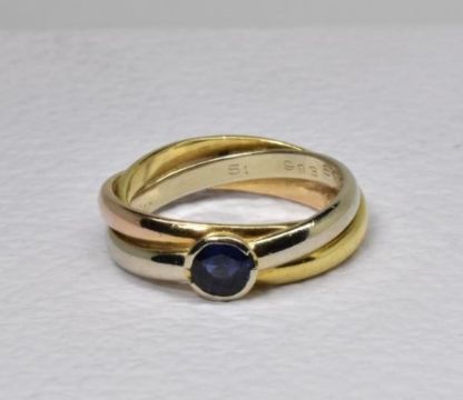 Cartier Sapphire Ring. A Cartier sapphire ring set in 18ct tri colour gold. The ring features a circular-shaped sapphire set to a tri-colour overlapping band. Hallmarked: Cartier, 913877 with French standard gold convention marks. Ring size K1/2. EU 51 US 5 3/4. Weight 6.6 grams. Overall condition good with some surface scratches/ wear, discolouration and minor dents in keeping with general age and wear. The sapphire is a dark blue hue, well saturated, with typical inclusions. The sapphire is possible a replacement of the original stone. Sapphire in good condition with some abrasion and minor nibbles to the girdle and facet edges.