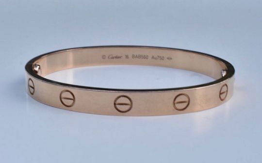 Cartier Love Bangle 18k. A Cartier 'Love' collection bracelet set in 18k rose gold. The bracelet an iconic piece designed in 1969, the LOVE bracelet has quickly become a must-have item. Inspired by the chastity belt and the idea that symbols of love should be everlasting. The bracelet is punctuated with screw head motifs, signed Cartier and numbered, stamped 750. The bracelet is sold with the box and screwdriver. Hallmarks: Cartier 16 BAB560 Au750. Cartier size: 16 inner diameter 5.3cm. Weight: 30.3 gramsCondition: The bracelet has just been polished after the pictures were taken and is as new condition.