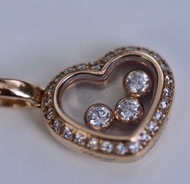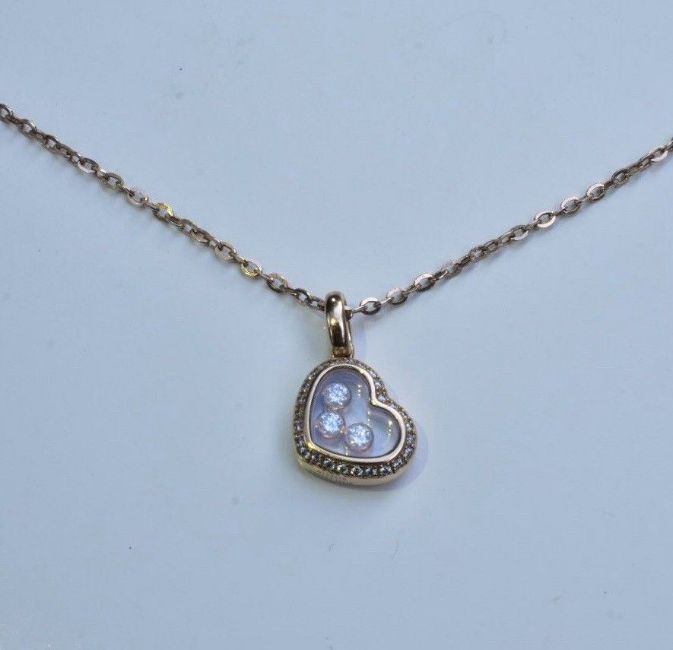 Chopard Miss Happy Diamond Pendant Necklace. A Chopard 'Miss Happy' diamonds pendant set in 18k rose gold. The pendant features a heart frame is grain set with sparkling brilliant-cut diamonds with three floating diamonds in the centre sold a with non Chopard 14k rose gold necklace measuring approx 15 inches. Hallmark: Chopard,750 6123316 796962 5004. Weight: 4.5 grams. Measurements: 10 x 11 mm. Diamond weight: 0.35 carat. Condition: overall good condition in keeping with general age and wear. Minor surface scratches to the gold. The gold chain in not from Chopard.