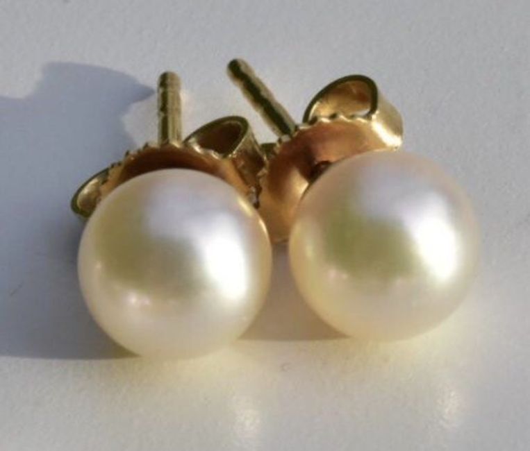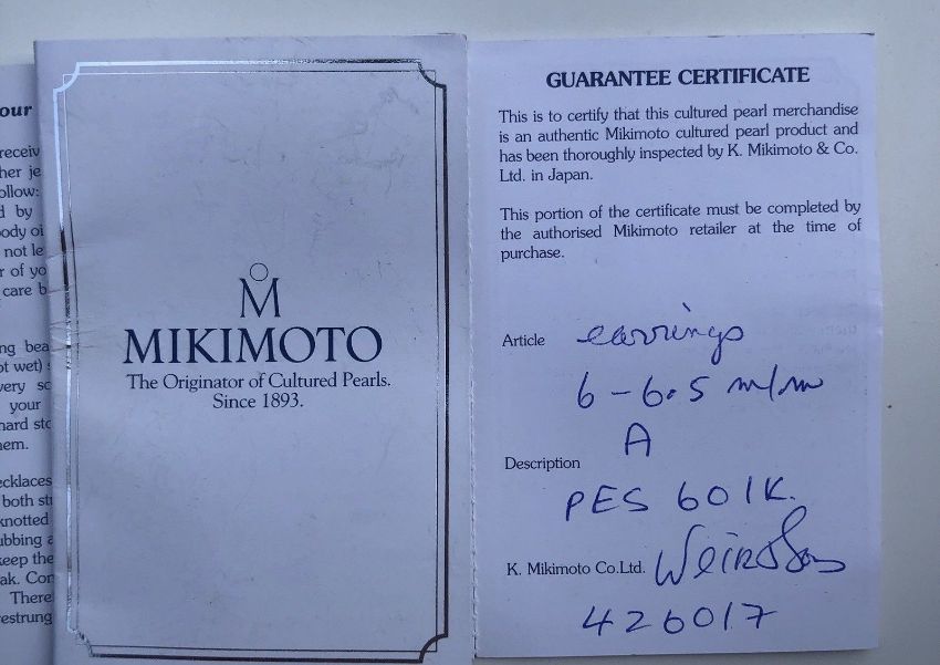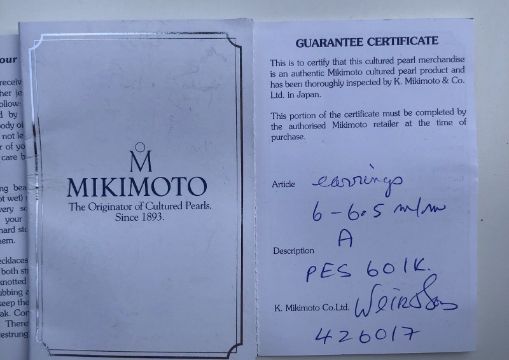 Mikimoto Akoya Pearl Necklace & Earrings Set 18k. A Akoya cultured pearl necklace en suite from Mikimoto set in 18k yellow gold. The pearl sautoir necklace features cultured pearls and measures 40cm in length. The earrings feature a single pearl earstuds each approx. 6.21mm diameter, mounted in 18K yellow gold. Sold with Mikimoto pouch and papers. Hallmarks: Mikimoto, 750. Weight: 5 grams. Earring measurements: 6.21 mm. Condition: very good condition with very light signs of any use