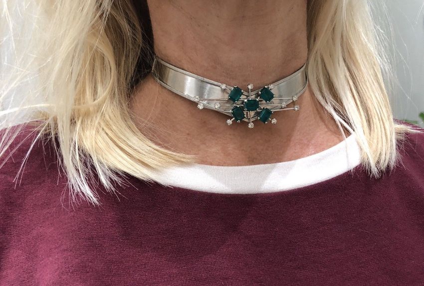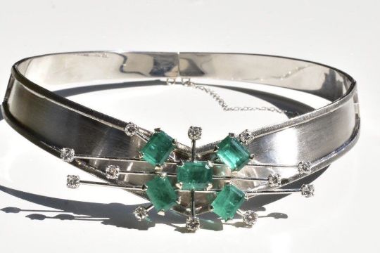 Emerald and Diamond Choker Necklace 14k. An Emerald & Diamond choker set in 14k white gold. The piece features five emerald-cut emeralds (synthetic) of approx 1.3 carat each set with twelve brilliant round-cut diamond of approx 0.10 carat each set with a click clousure and safety. Hallmarks: 14k. Weight: 50 grams. Length: 11.8 inches. Diamonds: 1.2 carat natural diamonds. Emeralds: Approx 6.5 carats. The emerald a man made, not natural emeralds. Condition: The choker is in excellent condition with very little sign of any wear. The diamonds are very bright and well matches and the emerald look very natural.