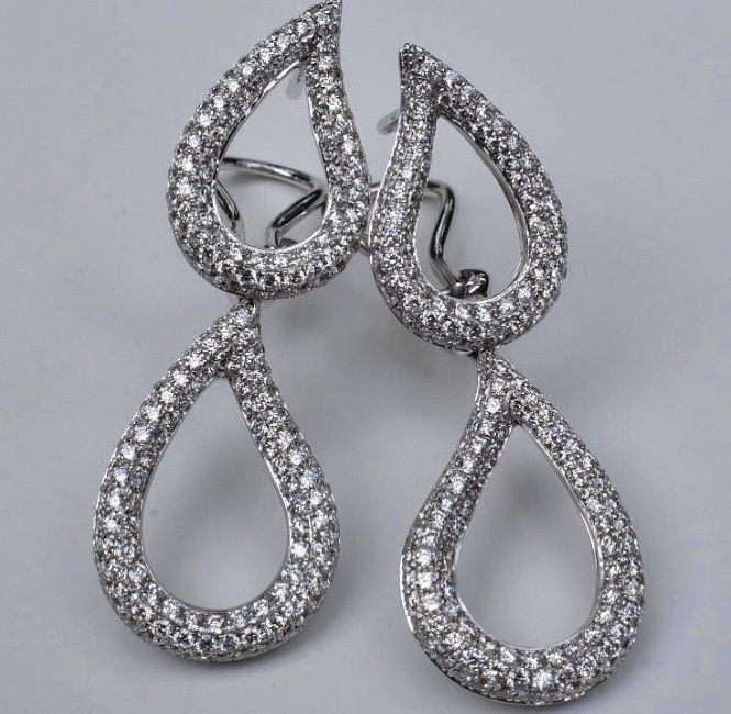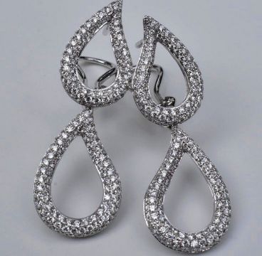 Bucherer Lacrima Diamond Earrings 18k. A fine pair of Bucherer diamond earrings from the 'Lacrima' collection. Each earrings features three hundred and eighty four round brilliant-cut daimonds in a pave white gold dangle setting. Diamond: 384 brilliant cut diamonds 1.49 carat total. Diamond clarity and color: G-H / Si. Dimensions: height 3.5 cm width 1.3 cm. Hallmarks: Bucherer 750 CB. Reference: 0122-839-9. Measurements: 3.5 cm. Weight: 9.5 grams. Condition Report: very good condition with light scratching to the clip on leaver system