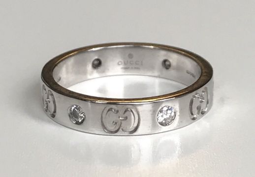 Gucci Diamond Ring 18k. A Gucci 'Icon' thin band set in 18k white gold. The ring features six brilliant-cut round diamonds set to a white gold band with the Gucci symbol embossed. Sold with pouch and box. Size: UK M, US 6 1/2, EU 53. Weight: 4.1. Diamonds: 0.22 carats. Hallmarks: Gucci, 750 with Italian gold markings. Condition: Good condition with very light signs of wear