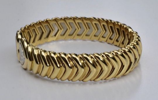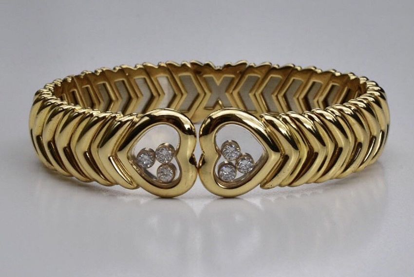 Chopard Happy Diamond Bracelet 18k. A Chopard 'Happy Diamonds' bangle set in 18k yellow gold. The bracelet features a chevron motif open cuff, with free-moving diamond collet glazed heart terminals. Etched 'Chopard Geneve' to one glazed panel only and 'Chopard' to inside of cuff. Hallmarked: Chopard,750 with serial number Diamond weight 0.25 carat. Inner diameter: 4.7cms. Weight 51.7grams. Width: 11mms. Condition: good, some surface scratches in keeping with general wear.