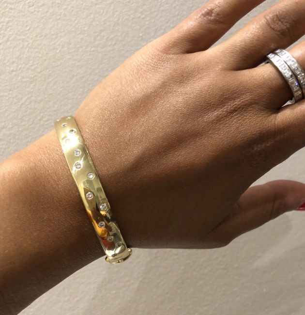 Boodles Diamond Bracelet 18k. A Boodles fine diamond bangle set in 18k yellow gold. The bracelet features 14 pave-set brilliant-cut round diamonds of approx 1 carat set to a hinged band with lock closure, sold in the original box. Hallmarks: B & D, 750 with crown hallmark and other UK gold standard markings. Weight: 55 grams. Measurements: inner circumference 6.6 x 5.3 CM,- width 9mm. Condition: good condition with some light surface scratches to the band in keeping with the general age and wear. The diamonds are bright and very well matched.