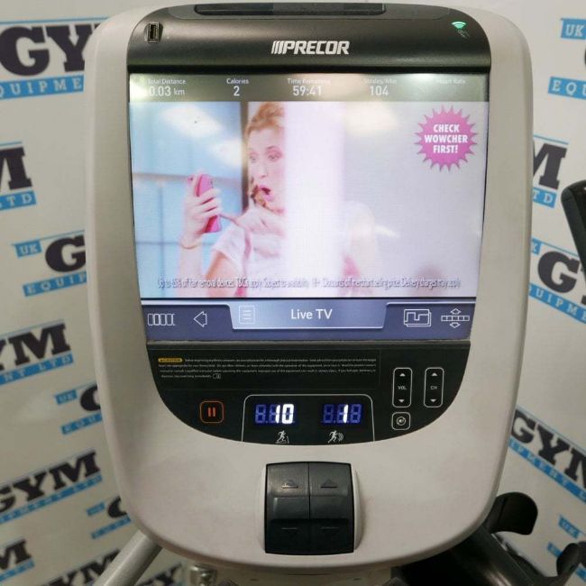 Precor UBK 885 Upright Bike - V7 w/ Internet Features The Precor UBK 885 upright bike is equipped with Precor’s new 15″ LCD P80 touch screen console. The brilliantly immersive console features a wide range of programs, entertainment features including digital TV / radio and internet access alongside the Preva workout tracking system. The dual sided pedals can be used with or without the straps as well. The steel frame is coated with a two-step-powder coating process to help prevent the machine from rusting. There are 25 different resistance levels ranging from 18 watts to 750 watts. It also has a belt drive system with a 3 phase generator to keep the battery running as efficiently as possible.Product Features:Handlebars - Handlebar design offers three riding positions - upright, cruising, and road. The overall width of the handlebars places the user in better ergonomic position with the forearms more directly under the shoulders. In the road position, the ergonomic-shaped handlebars position the wrists in a natural, neutral position.Seat - Ergonomic seat design with comfort groove. 10.5 inches (27 cm) width that quickly tapers to a narrow nose for improved riding comfort. Universal seat post allows easy installation of your own saddle.Biomechanics - KOPS Biomechanics (Knee Over Pedal Spindle) - to achieve proper pedalling biomechanics, the seat post and seat post offset from the crank is key to aide in efficient pedalling and reduced shear force on the knee. The seat post angle is 74 degrees with a 5 inch (13 cm) offset from the crank axle. This places the forward knee directly over the ball of the foot (or pedal spindle) when the pedals are in a horizontal position.Specification:Length: 1220mm / 48in Width 530mm / 21inHeight: 1570mm / 62inProduct Weight: 160 lbs / 73 kgSelf Powered: YesMax User Weight: 350 lb / 159 kgPre-set Programs: 13Console Type: LCD - Precor P80 ConsoleHeart Rate Sensors: Yes, built in hand sensors and polar chest strap compatible.Please note, this is a refurbished item.