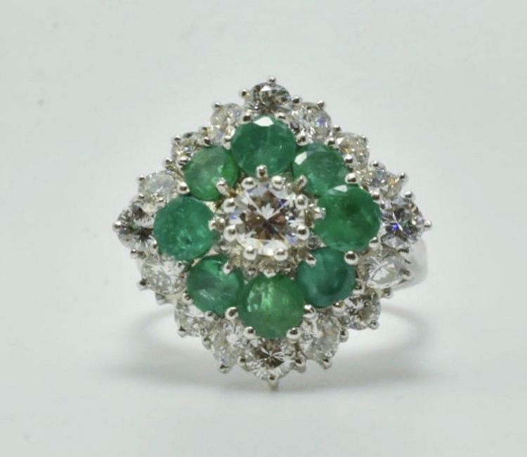 A diamond and emerald cluster ring set in 18k white gold. The ring features a central brilliant round-cut diamond of approx 0.25 carat and a surround of eight round emeralds of approx 0.90 carat and a further sixteen round brilliant-cut diamonds of approx 1.28 carat total, set to a plain white gold band. Hallmarks: Unmarked Size: UK L 1/2 US 6 EU 52 Weight: 6.5 grams Diamonds: 1.53 carat total with a central diamond of 0.25 carat Emeralds: approx 0.90 carat Condition: Good condition in keeping with general age and wear with bright clear diamonds.