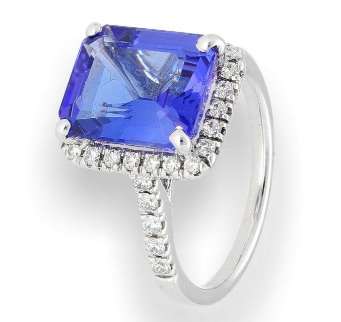 18Carat White Gold 5.15ct AAA Tanzanite & Diamond Halo Solitaire Ring (Size M) Metal: White Gold, Main Stone Shape: Emerald, Main Stone Colour: Blue, Sizable: Yes, Ring Size: M, Total Carat Weight (TCW): 5.57, Style: Solitaire, Metal Purity: 18Carat, Main Stone: Tanzanite, Secondary Stone: Diamond