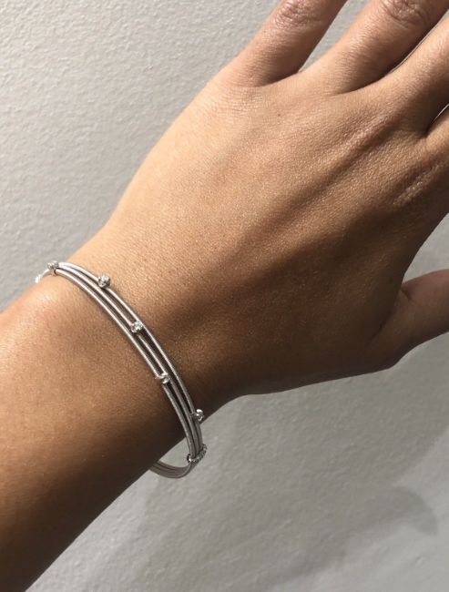 A Marco Bicego 'Goa' collection bracelet set in 18k white gold. The bracelet is composed of three coiled strands, claw set at intervals with five round-brilliant cut diamonds, and two diamond set spacers. We have the matching necklace listed on EBay Retail price £2,475 Hallmarks: Marco Bicego, 750 Length: 18cm Estimated total diamond weight: 0.30cts Condition: Good overall condition with only light surface marks and wear, with bright well matched diamonds