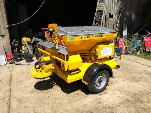Pozi feed TS500HS Gritting TrailerSingle axleGTW 1300kg Fully enclosed hopper with accessible door Auger drive discharge spinnerHonda GX2000 petrol 6.5hp electric start engineBeacon